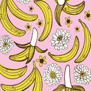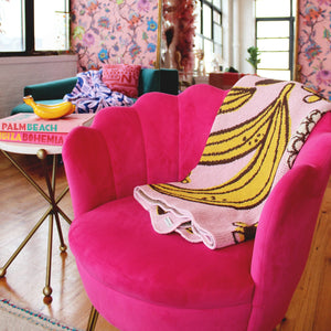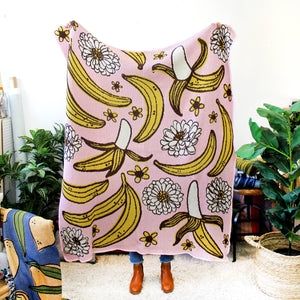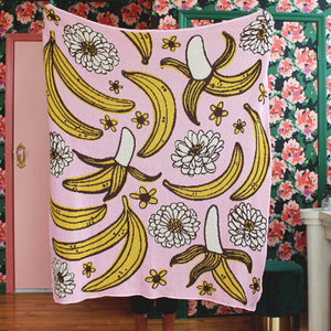 Bananas on bananas! Playful banana and flower design. Bright yellow bananas and white flowers on pink ground. Aprox 50"x60", Recycled Cotton/Acrylic with stitched edge. Machine wash cold on delicate, tumble dry low delicate. Designed in Brooklyn & Made in the U.S.A.
