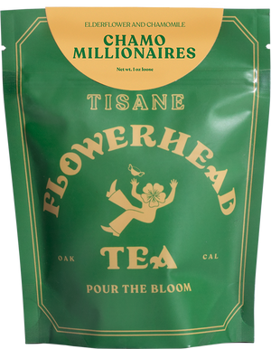 Chamomile has been prepared for thousands of years and is still honored for its great curative properties. Chamomile comes from the Greek ‘chamai melon‘ which means ‘ground apple’. The fragrance and flavor of whole chamomile flowers is like a crisp apple with a floral sweetness. Elderflower is used to treat swollen sinuses, colds, bronchitis, diabetes and the flu. It’s also great for coughs, hoarseness and shortness of breath. Sipping on hot Chamomillionaires has a natural calming effect and the combination of these herbs leave you feeling centered and relaxed.