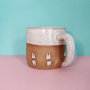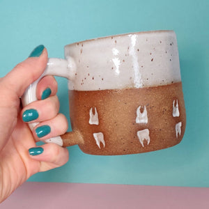 Thrown stoneware mug. The interior, handle, and top half of the mug are glazed a satin white that shows off the speckles in the clay. The bottom portion of the body has two rows of teeth stamped in and also glazed the same satin white.  Size guide: While some variation can be expected with handmade items, the sizes generally are: 8oz mug is 3 inches tall, 3 inch diameter. 12oz mug is 3.5 inches tall, 3 inch diameter. 16oz mug is 4.5 inches tall 3.5 inch diameter. Care Instruction : Dishwasher and microwave safe
