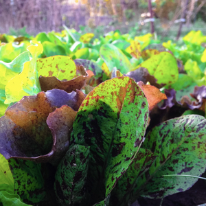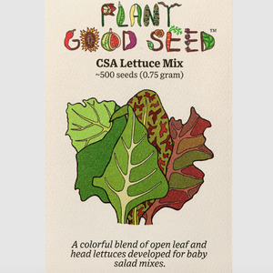 This mixture is composed of four lettuce (Lactuca sativa) varieties: two leaf types (Red Sails, Black Seeded Simpson) and two headed (Freckles Romaine and Parris Island Romaine). The beauty of this mix is its dynamism. While we primarily grow and harvest the plants for bagged lettuce, it's possible to sow seeds a bit thicker, harvest the leaf varieties, and keep the romaine types for full sized heads. It's a good all-season selection, due to the staggered growth rates of the specific varieties: the faster growing Black Seeded Simpson and Red Sails are perfect for early harvests in the summer (but grab them fast, because they bolt quicker in the heat), while the romaines get their time to mature for full head harvests. During cooler seasons, the leaf varieties are slower to bolt and can be harvested for full sized heads, while the romaines work excellently for baby leaf harvests.