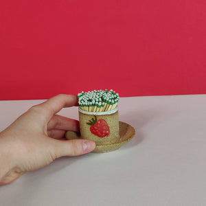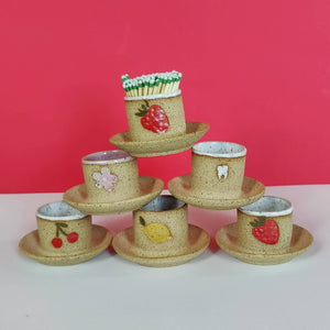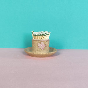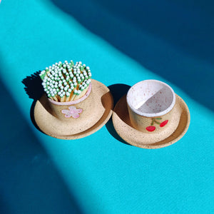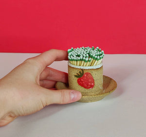 Match strikers! They come in a bunch of classic designs: Strawberry, Cherry, Lemon, Tooth, and Primrose (so far). They are designed to hold matches in the cup, to be able to strike matches on the unglazed surface, and then have a spot (the dish) to lay down your spent matches. MUST use strike anywhere matches. Each match striker might be a slightly different size but in general they are about 2 inches tall, with a 2 inch diameter cup and a 3.25 inch overall diameter. Each match striker has just one stamp on it to maximize the area where you can strike the match. The inside of the cups are glazed.