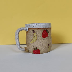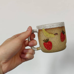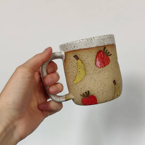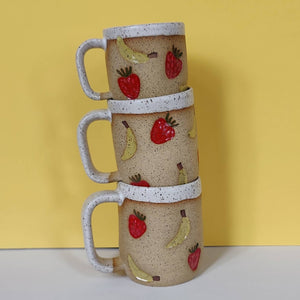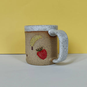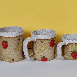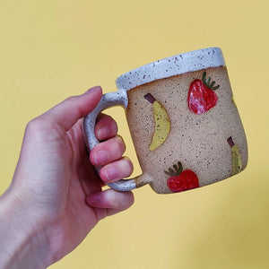 This is the new and improved version of the smoothie mug! The inside, lip, and handle are all glazed a smooth satin white that shows the speckles of the clay. The strawberries are glazed glossy red and green and the bananas are glazed a glossy yellow and then matte brown at the tip. Dishwasher and microwave safe. All items are handmade and so some size and color variation may occur, even with items of the same size.