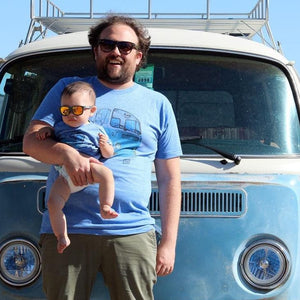 Out for strolls with his baby, who seemed never to sleep, Sean collected vintage images from the streets of LA that he silk-screened onto onesies; later, he began to illustrate from photographs taken around his Venice neighborhood—where gradient sunsets now appeared out his window. With an artistic style naturally attuned to the raw playfulness of kids, orangeheat grew in step with his son, and it now outfits singular kids from newborn to size 12.