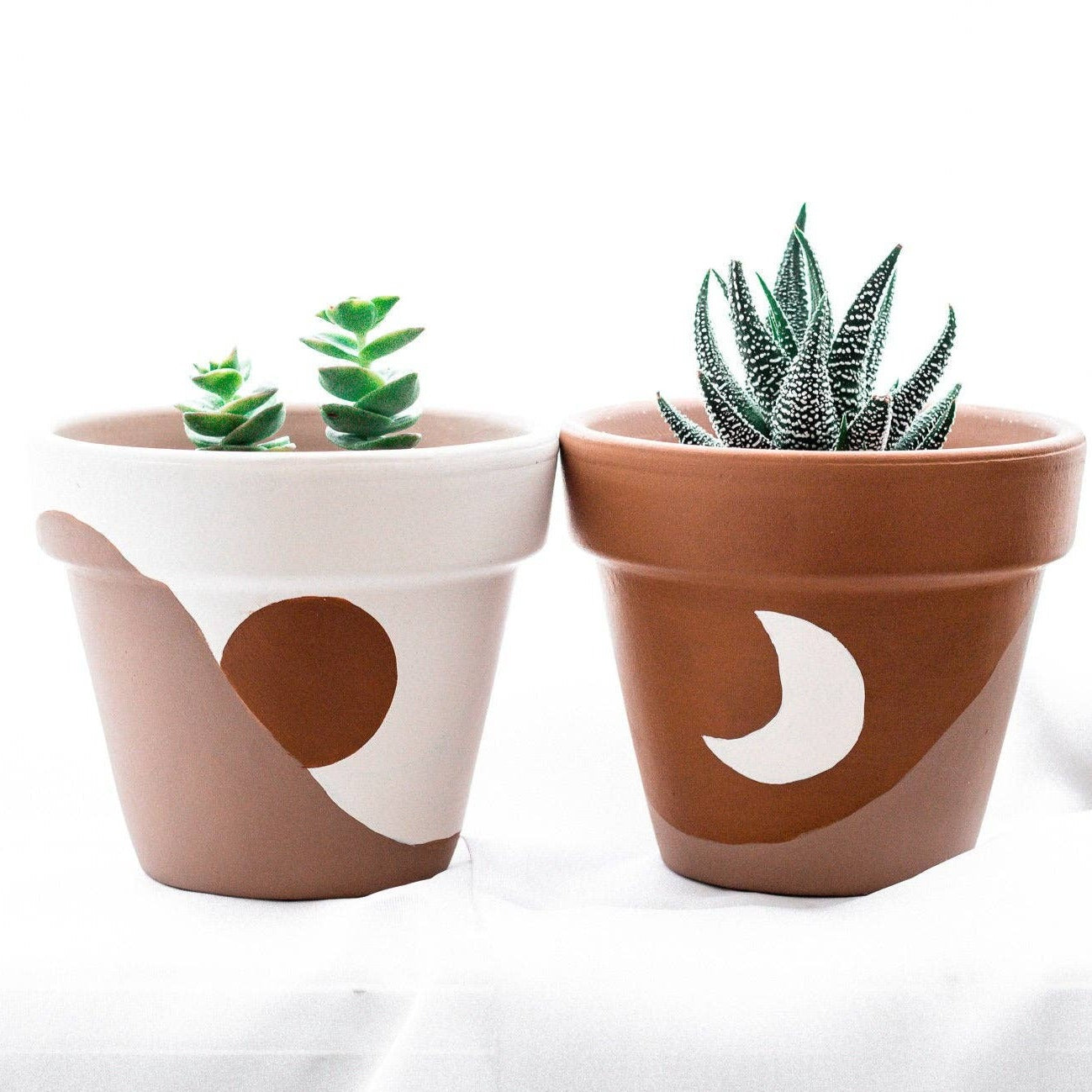 Sun and Moon Pot Set | Hand Painted Terracotta Pots with Drainage Hole