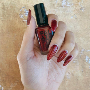 This listing is for one full sized bottle of nail polish (0.5 oz/15 ml) in Chamoy, a saucy red with subtle gold shimmer. All bottles come with 2 stainless steel mixing balls.